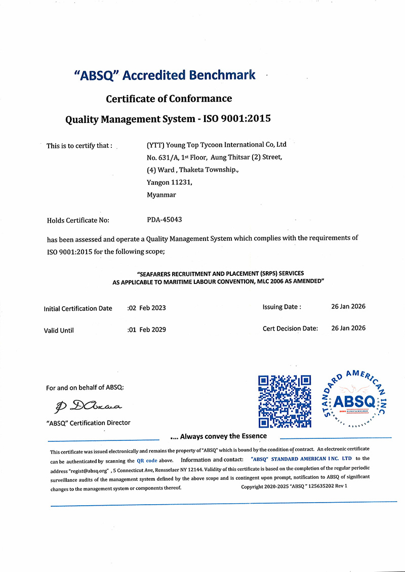 We would like to introduce ourselves as (YTT) Young Top Tycoon Tourism Co., Ltd.( ISO 9001:2015 and ASTA Registration Company Issued by American Bureau of Shipping (ABS Quality Evaluations) and American Society Of Travel Agents (Member No. : 900258630)) Our travel agency established in 2010 at Yangon, Myanmar. Young Top Tycoon Tourism License is No. Kha – 1561 issued by the Union of Myanmar Ministry of Hotels and Tourism.